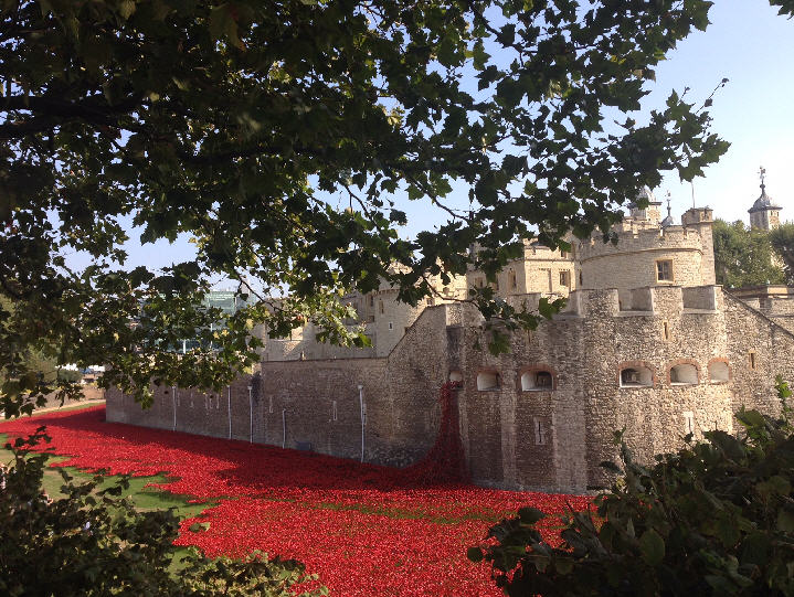 Timed to mark the centenary of the first day of Britain’s participation in the First World War, this breathtaking memorial provided a moving tribute in commemoration of British and Commonwealth soldiers killed in the 1914-18 war. Paul Cummins and Tom Piper designed and directed a magnificent poppy installation to spread around the Tower of London in the dry moat. Paul Cummins found inspiration for the title of the installation in the first line of the Will of a Derbyshire man who signed up at the war’s beginning, witnessed carnage and misery, and died in Flanders. The installation commenced on August 5th, 2014, when volunteers started to plant ceramic poppies each day in the dry moat until 888,246 were placed, one for each British and Commonwealth fatality. The installation was completed by Armistice Day on 11th November, 2014. “The Weeping Window” and “The Wave” were two major features of Blood Swept Lands and Seas of Red. After the installation was dismantled, these features went on tour to venues across the United Kingdom until the end of the Centenary in 2018. Ultimately, they will join other parts of the installation on permanent display in the Imperial War Museums in London and Manchester. The installation work was commissioned by Historic Royal Palaces, an independent charity, and the majority of the ceramic poppies were sold to the public to benefit military charities. (My thanks to www.britishlegion.org.uk and poppies.hrp.org.uk for information.) |